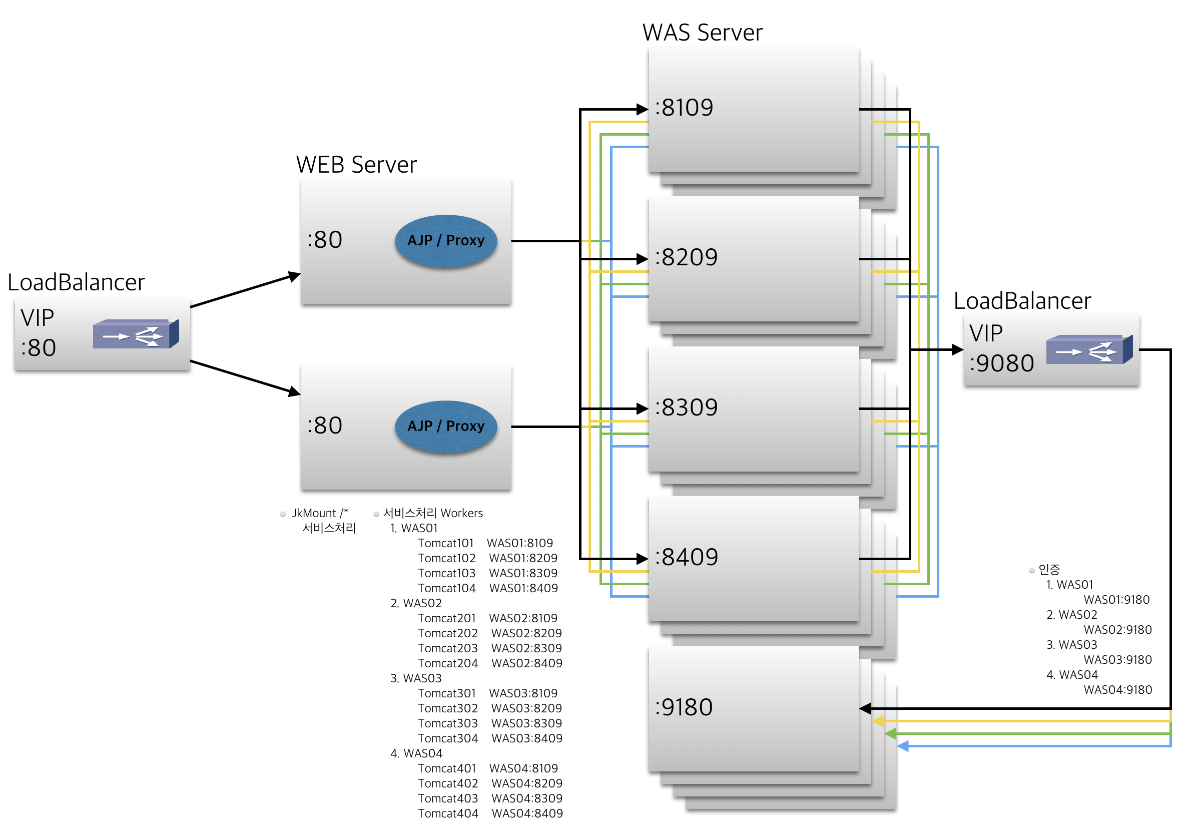 이 그림에서는 웹에서의 사용, 즉 worker 의 이름과 각 워커가 분배하게 될 각 WAS Server 의 Hostname( ex : WAS01 )에서 사용중인 서비스처리 Instance AJP Port 를 표기하고 (Proxy의 경우 WEB Port), 각 서비스처리 Instance 에서 인증 요청시 로드벨런서를 통해 인증 Instance 로 WEB Port 접근을 하게된다. 이때 각 서버내의 포트는 동일하고 Port 번호는 전부 동일하다.