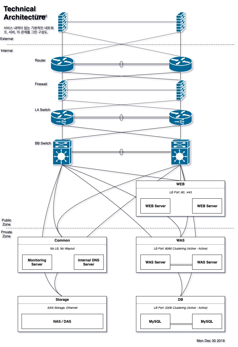 * 모든 서버와 네트워크 장비는 장애를 대비하여, 이중화 이상 다중화를 구성하고 병렬처리가 불가능한 방화벽 및 Batch 등은 Active - Standby 등으로 구성한다.
