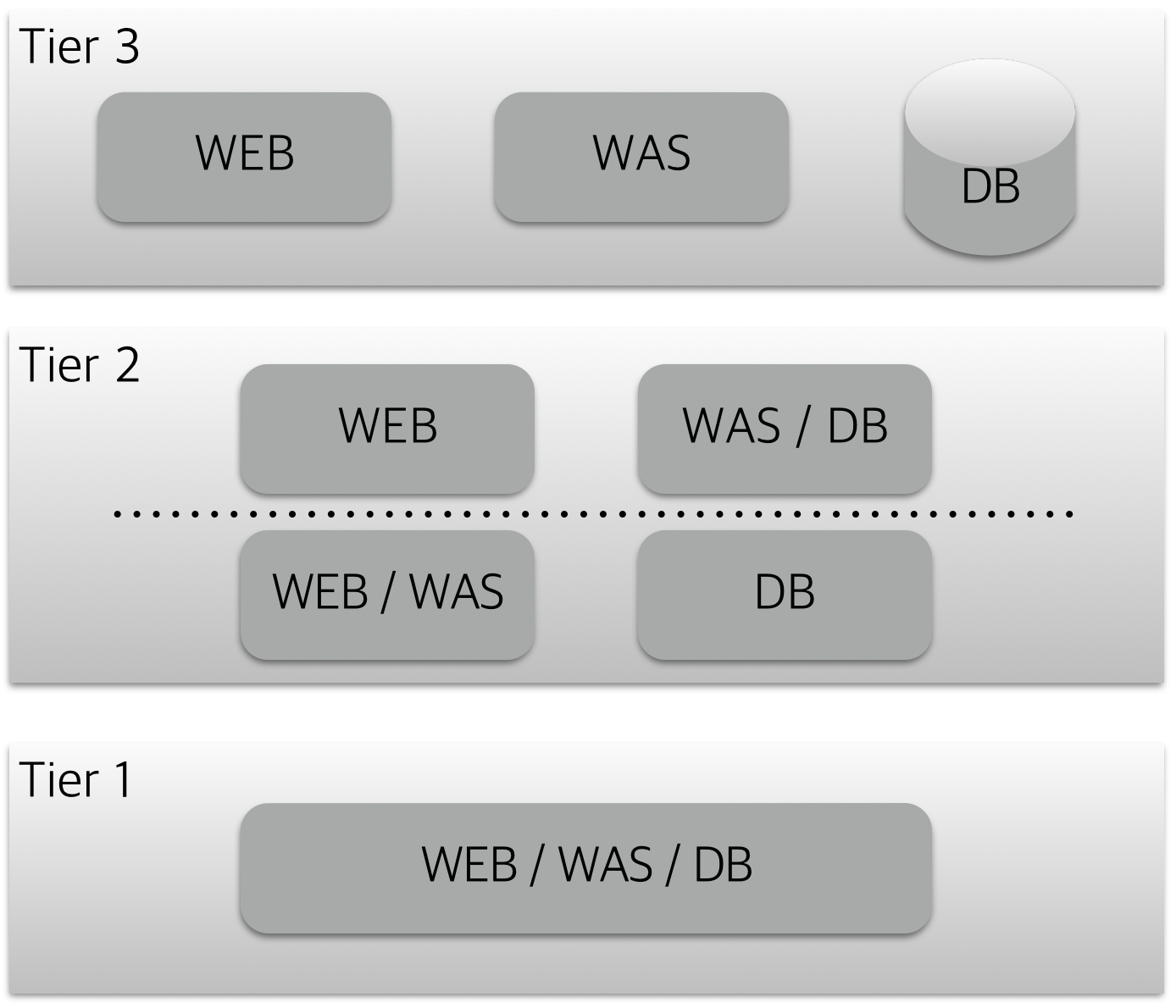서비스는 크게 3Tier 로 구분되고, WEB, WAS, DB 로 성능의 분배에 따라 구성된다. 1Tier 와 2Tier의 구성도 가능하며, 개발기와 테스트기에 적용되며 대부분 아래와 같이 구분된다.