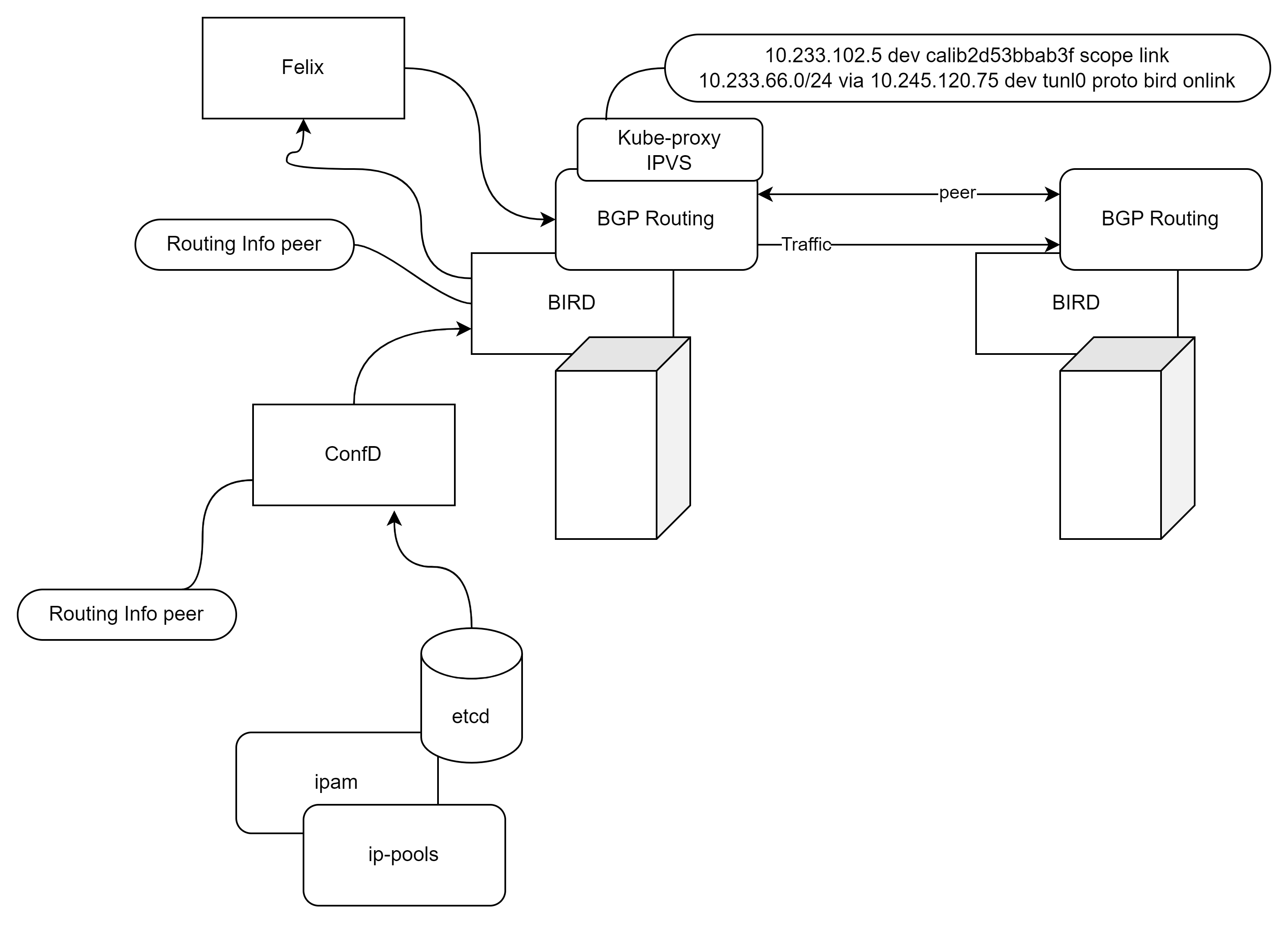 확인 한 부분이 조금 길어지네요. bird는 BGP를 생성하여 Routing Table을 생성해주네요. Felix는 모든노드의 endpoint 와 etcd의 정보를 읽고 쓰고 iptables/ipvsadm 등을 컨트롤합니다. confd는 etcd에 bird의 구성을 업데이트 하거나 변경을 감시합니다.