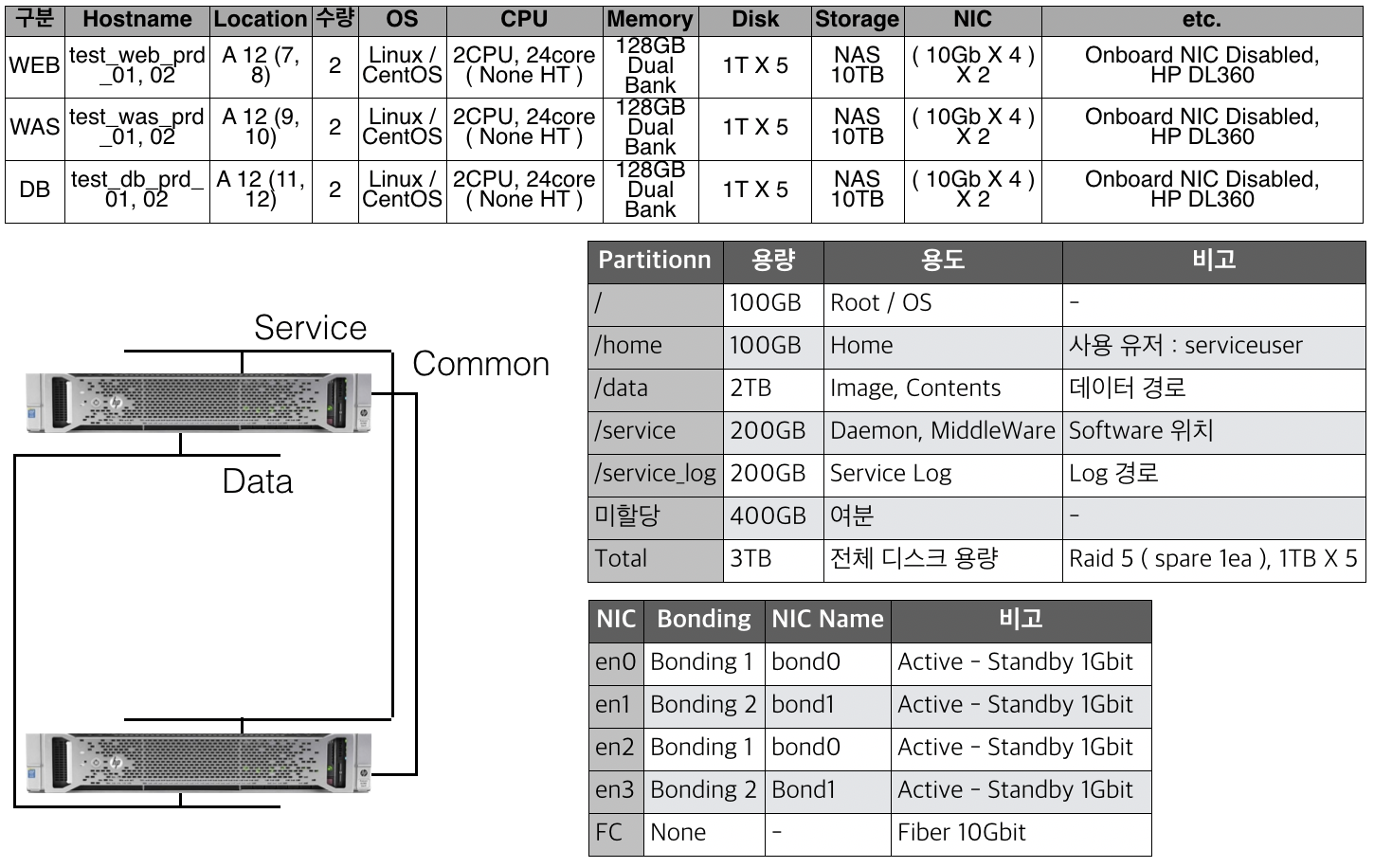 서버는 각 서버별, 혹은 서버 종류별로 구분하고, 가능한 동일하게 구성한다. Hostname 의 경우 OS 를 설치할때도 구성하지만, 동일하게 서버에서도 정의하고 관리시에 오차가 없게 한다. 서버의 위치도 정확하게 기록하고 CPU 와 RAM 그리고 Disk 또한 용량과 수량을 정확히 ( 가능하면 속도와 종류를 알고 있어야 한다. Disk의 경우 자주 문제가 생기는 부분이고 교체를 위해서도 정확히 알아둔다. Disk는 1장을 사용하는것은 아니고 Raid 를 사용하여 이중화 혹은 다중화를 하여 속도와 데이터의 안정성을 추구한다. 예를 들면, 1TB Disk 5장에 여유디스크 1장을 사용하게 된다면, 실제 사용할 수 있는 Disk의 용량은 3TB가 된다. 속도또한 2배이상 빨라진다고 보면된다. 그래서 2장 혹은 1장을 쓰는 Raid 0 혹은 1은 속도의 이득은 없다. Disk로 인한 속도 저하는 심각할 수 있으므로 가능한 빠른 디스크 사용방식을 선택해야 한다. 최근에는 SSD 의 사용을 많이 하므로 SSD 의 적용도 적극적으로 검토하는것이 좋다.