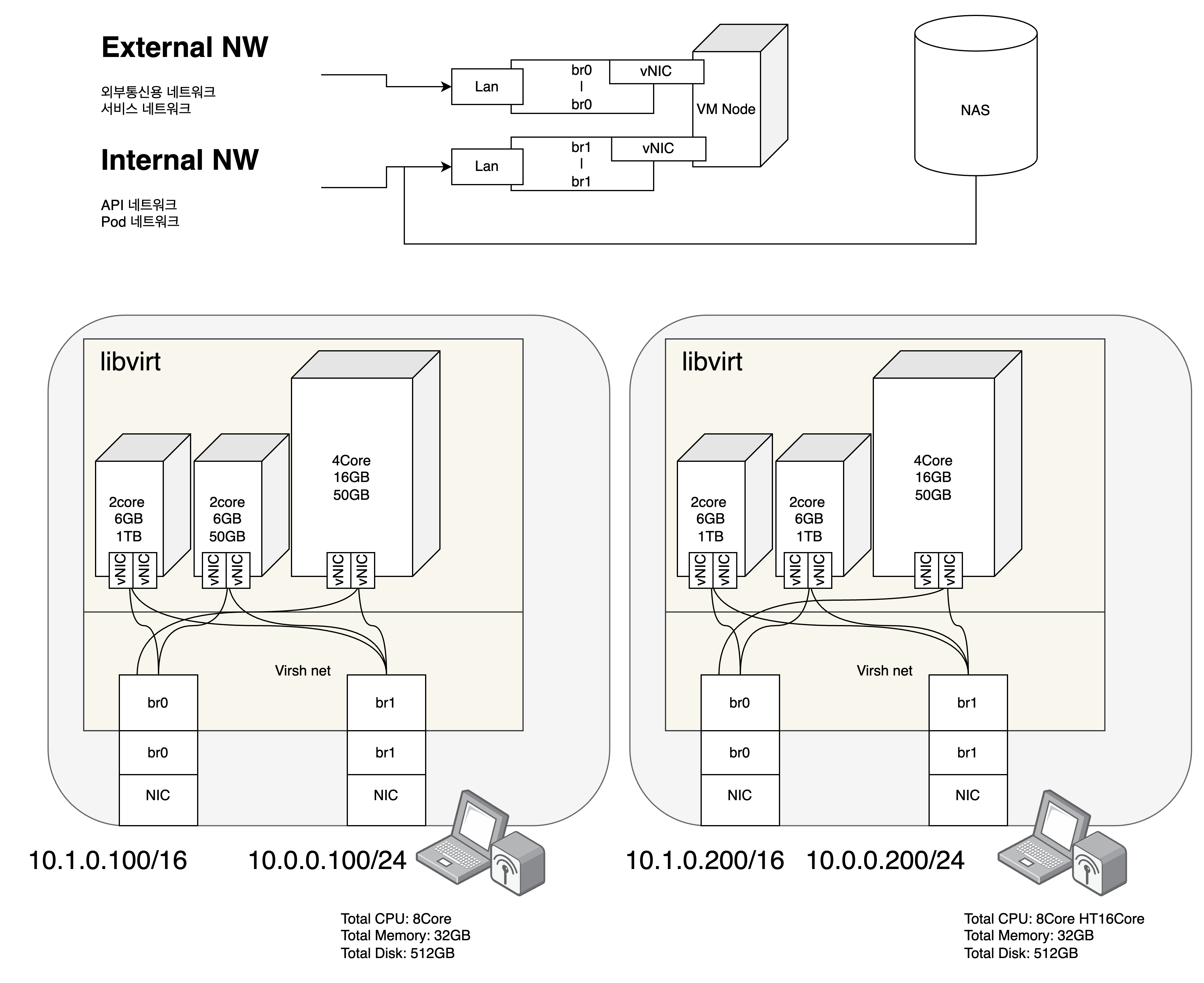 가상 환경 서버 생성 노트북 2ea를 이용한 VM Node 6ea를 생성하는 예시입니다. HostOS는 Ubuntu 22.04(Live Image)이고, VM 으로 구성되는 GuestOS는 Ubuntu22.04(cloud Image)입니다. External과 Internal을 구분하기 위해 2개의 Lan을 Bridge화 하여 각각 libvirt 의 br0, br1의 브릿지로 구성하였습니다. 노트북의 성능은 각각 8코어 32GB 메모리에 512GB 스토리지 그리고 1기는 1TB의 스토리지가 추가로 구성되어 있습니다. 각 노트북에 Ubuntu 22.04를 설치 한 후, libvirt를 설치하고 Bridge 설정을 합니다. ### libvirt 설치 apt install qemu-kvm libvirt-daem..